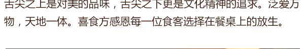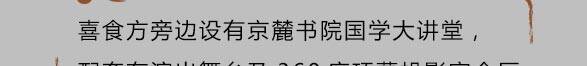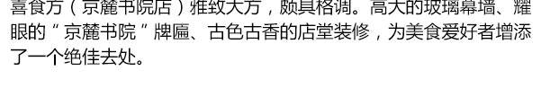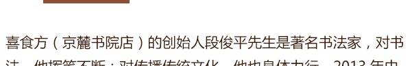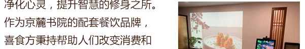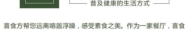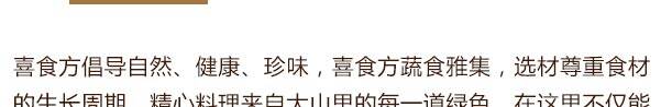 喜食方是京麓书院万柳分院配套餐饮品牌,坐落于京麓书院万柳分院内,主打新京派素食意象菜人文雅集。 喜食方(京麓书院店)独创“自然健康,写意养生”为主题的24节气养生素食京派意象菜,将季节时令最鲜的食材入馔。发古遵时,甄选自然馈赠专属季节的美味,并推出“品高·意雅·趣足·古韵”为主题的“文化下午茶”。满足现代人对修心及养身的溯源,打造别具一格的新蔬食素食风尚,是体验京派素食文化的佳选。